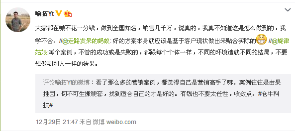 在昨天晚上,看到微博里知名自媒體人喻拓Yt發(fā)表了一條微博:看了那么多的營銷案例,都覺得自己是營銷高手了嘛。案例往往是由果推因,切不可生搬硬套,找到適合自己的才是好的。有錢也不要太任性,收斂點。微博發(fā)出后引起了大家的評論,后來喻拓Yt又評論轉(zhuǎn)發(fā)了一句:大家都在喊不花一分錢,做到全國知名,銷售幾千萬,說真的,我真不知道這是怎么做到的,我學(xué)不會。
