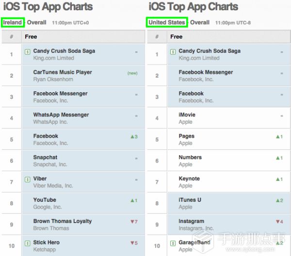 在上述的例子中,美國最受歡迎的10款iOS應(yīng)用均被大型開發(fā)者壟斷,而在愛爾蘭,排在第2和第10的開發(fā)者的規(guī)模都相對較小,而第9位的更是一家本地公司。