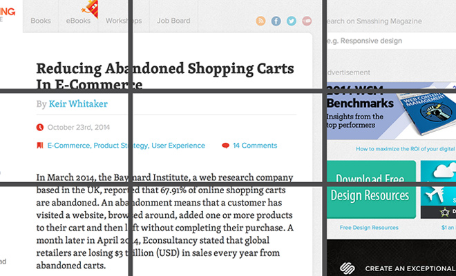 其實在版式設(shè)計中,也有類似的原則和規(guī)范。比如,當你在頁面頂部使用大Banner圖的時候,它通常會占據(jù)頁面大概2/3的高,類似的,標題和正文的字體大小也需要大小對比,讀者會自然而然地注意到更大的Banner圖、標題和副標題。大小對比是一方面,另外一方面還需要考慮頁面上圖片和文字的位置。簡單的使用三分法并不能確保構(gòu)圖的飽滿,將九宮格置于頁面上,適當?shù)卣{(diào)整頁面的元素的位置和中心之后,會好不少。