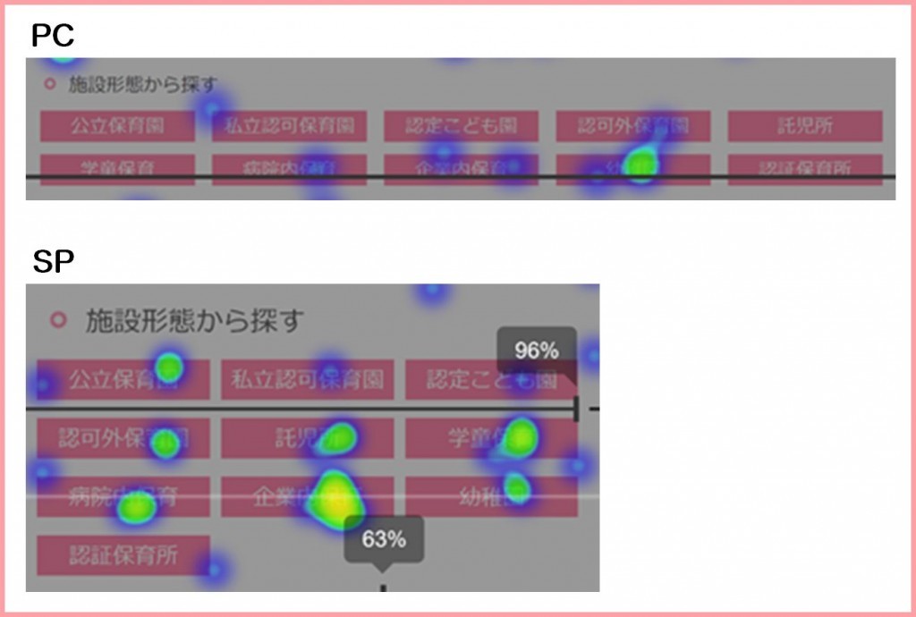 下面是關于職位內(nèi)容瀏覽。無論是PC還是移動終端,熱門職位都會有很多點擊,但是通過展示形態(tài)上的不同,被點擊的職位,在PC和SP上有很大的差異。PC上只有幼兒園教師被多次點擊,但是移動終端有7個不同的職位被點擊。