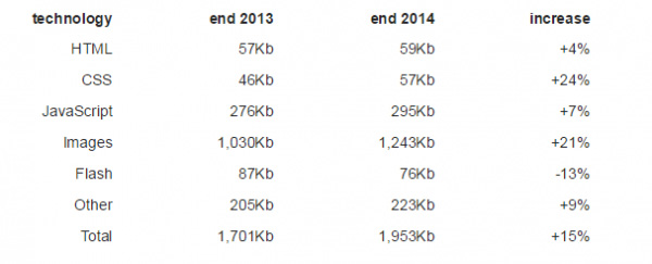 隨著基礎(chǔ)設(shè)施的發(fā)展,我們的網(wǎng)速是越來越快了,那你是否感受到網(wǎng)頁(yè)加載速度變快了呢?有沒有想過,網(wǎng)頁(yè)也在逐漸變臃腫?根據(jù)HTTP Archive的報(bào)告,在調(diào)查了約50萬(wàn)網(wǎng)頁(yè)后,他們發(fā)現(xiàn)每個(gè)網(wǎng)頁(yè)的平均容量稍小于2Mb,達(dá)到了1953Kb,比去年上升了15%。 當(dāng)然,調(diào)查的網(wǎng)站不包括那邊復(fù)雜的網(wǎng)頁(yè)應(yīng)用。去年,這一上升比例是32%,雖然今年幅度縮小,但同樣不令人樂觀。