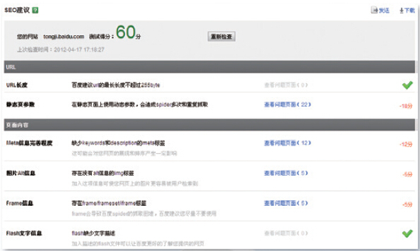 了解了自己的網(wǎng)站有多少被收錄了,下一步就是提高網(wǎng)站的SEO水平。之前百度大搜索部門曾經(jīng)發(fā)布過(guò)《百度創(chuàng)業(yè)者俱樂(lè)部搜索引擎優(yōu)化指南》,其中對(duì)基礎(chǔ)的網(wǎng)站SEO建設(shè)給出了詳細(xì)的說(shuō)明,請(qǐng)大家通過(guò)百度搜索引擎搜索并下載了解。此方法論現(xiàn)已部分產(chǎn)品化,即作為一個(gè)報(bào)告出現(xiàn)在百度統(tǒng)計(jì)當(dāng)中——【SEO建議】:就像當(dāng)前流行的360安全助手給電腦的健康情況打分一樣,此報(bào)告能對(duì)網(wǎng)站的SEO情況打分,完全量化SEO水平,并且指出那些頁(yè)面有問(wèn)題(尤其檢查首頁(yè)等重要頁(yè)面),有什么問(wèn)題(缺少keywords和description的meta標(biāo)簽,這可能會(huì)對(duì)網(wǎng)頁(yè)的展現(xiàn)和排序產(chǎn)生一定影響),怎么樣解決(建議添加信息,讓搜索引擎知道這些內(nèi)容的意思)如圖所述: