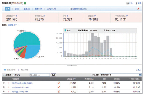 和剛才的搜索引擎流量分析一樣,還是要先了解外部鏈接流量。在百度統(tǒng)計(jì)中有【外部鏈接】報(bào)告,其中列出了所有外部鏈接帶來(lái)流量的表現(xiàn)。此處建議還是按照細(xì)分的方法:第一步,根據(jù)關(guān)注的維度排序指標(biāo),如在引入流量維度則按照IP由高到低排序,找到最有影響或者關(guān)注的外部鏈接;第二步,如果區(qū)別較大則將這些鏈接歸類,補(bǔ)充相應(yīng)的比率或者平均值分析,分別對(duì)待每個(gè)分類的鏈接組群;第三步,看每個(gè)外部鏈接的具體數(shù)據(jù)指標(biāo)排查問(wèn)題或者找到機(jī)會(huì)。其中最后一步需要具體問(wèn)題具體分析。