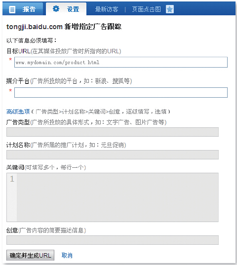 另外,在百度統(tǒng)計(jì)中,站長(zhǎng)可以通過(guò)“定制目標(biāo)URL”的方式獲取其他媒介營(yíng)銷的數(shù)據(jù)。在設(shè)置百度統(tǒng)計(jì)頁(yè)面和指定廣告跟蹤頁(yè)面中均存在定制目標(biāo)URL 的鏈接,通過(guò)點(diǎn)擊此鏈接可以進(jìn)入定制目標(biāo)URL 的頁(yè)面。在定制目標(biāo)URL 頁(yè)面中填寫需要跟蹤的媒介相關(guān)信息,包括目標(biāo)URL、來(lái)源名稱、媒介名稱、計(jì)劃名稱、關(guān)鍵詞和創(chuàng)意等信息,百度統(tǒng)計(jì)會(huì)根據(jù)填寫的信息生成一個(gè)URL,將此URL 作為推廣的目標(biāo)URL 后,訪客點(diǎn)擊此站外URL,百度統(tǒng)計(jì)便會(huì)按照填寫的信息將本次訪問(wèn)進(jìn)行歸類并顯示在【指定廣告跟蹤】報(bào)告中。