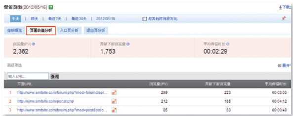 在百度統(tǒng)計(jì)中有專門的【受訪頁(yè)面】報(bào)告,在數(shù)據(jù)表的右上方有多tab設(shè)計(jì)幫助站長(zhǎng)迅速切換做“頁(yè)面價(jià)值分析”、“入口頁(yè)分析”、“退出頁(yè)分析”,此節(jié)主要介紹第一點(diǎn):