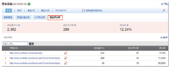在百度統(tǒng)計的受訪頁面報告中可以切換到“退出頁分析”快速查看退出頁相關指標指標并分析。