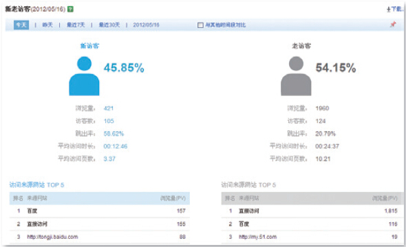 另外,在百度統(tǒng)計(jì)中有【新老訪客】報(bào)告,其中細(xì)分了二者來源、訪問頁面等指標(biāo),讓站長區(qū)分新老訪客的不同行為。