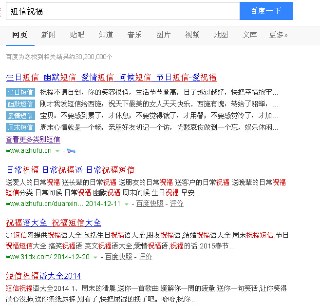 就例如說小編搜索的短信祝福這個詞,百度收錄了 3020萬條,說明競爭力度挺大的,通常這樣的詞優(yōu)化的話,大概在3個月左右可以獲得不錯的排名。但是不同的行業(yè)關(guān)鍵詞在競爭力度和優(yōu)化時間上也是不同 的,越熱門的行業(yè)當然競爭力度越大,所以我們在選擇,我們要盡可能的選擇一個目標關(guān)鍵詞+一個核心兩個長尾關(guān)鍵詞,效果是最好的,就比如說短信祝福是核心 的關(guān)鍵詞,那么我們可以擴展一個生日祝福、經(jīng)典短信等長尾關(guān)鍵詞。