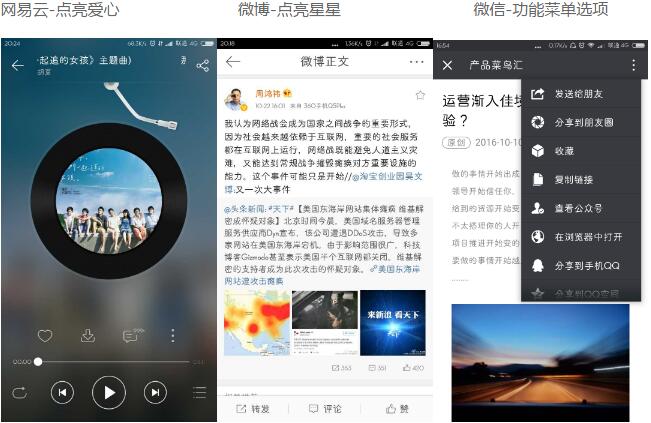 豆瓣中,添加收藏會(huì)進(jìn)行計(jì)數(shù),這個(gè)“收藏”數(shù)據(jù)很大程度上成為了這個(gè)信息“被贊同”的評價(jià),用戶對信息的第一印象很難不受此數(shù)據(jù)的影響;微博中,點(diǎn)亮星星純粹是作為添加收藏的功能鍵以及作為“已收藏”的標(biāo)識,下方tab功能欄可以進(jìn)行點(diǎn)贊,對信息進(jìn)行評價(jià)。