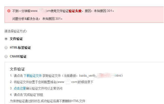 5、文件驗證有時候也會出現驗證失敗的情況。使用其它任意一種方式都可以,如果是301的問題可以臨時修改服務器的配置,或者使用其它任意一種驗證方式。