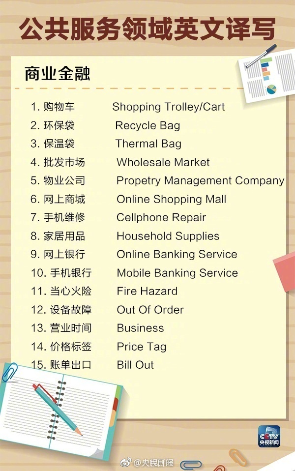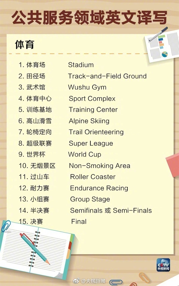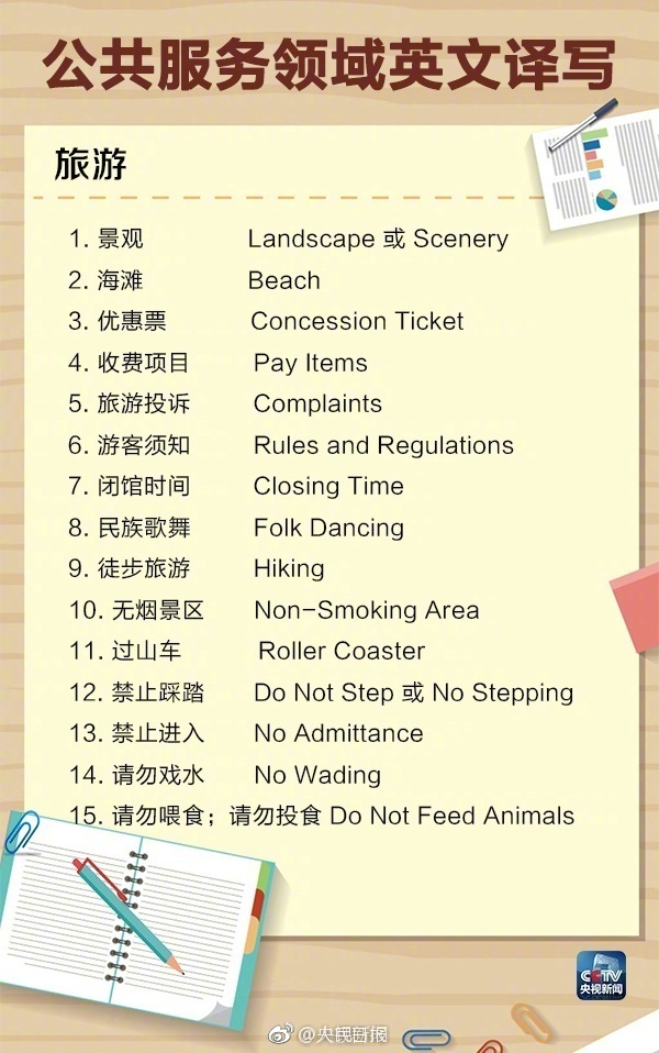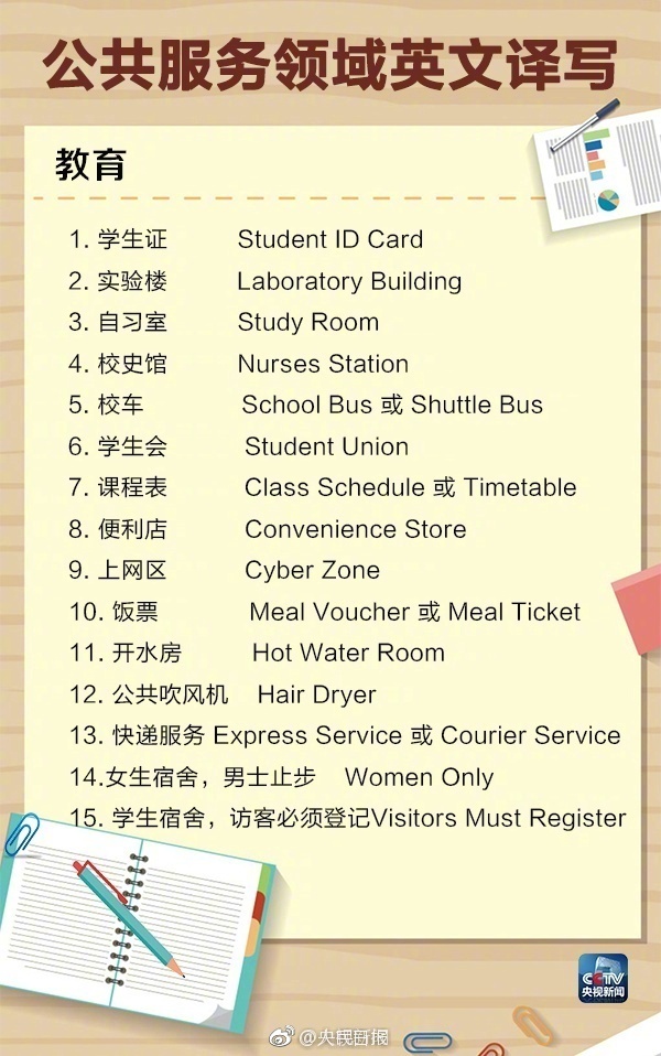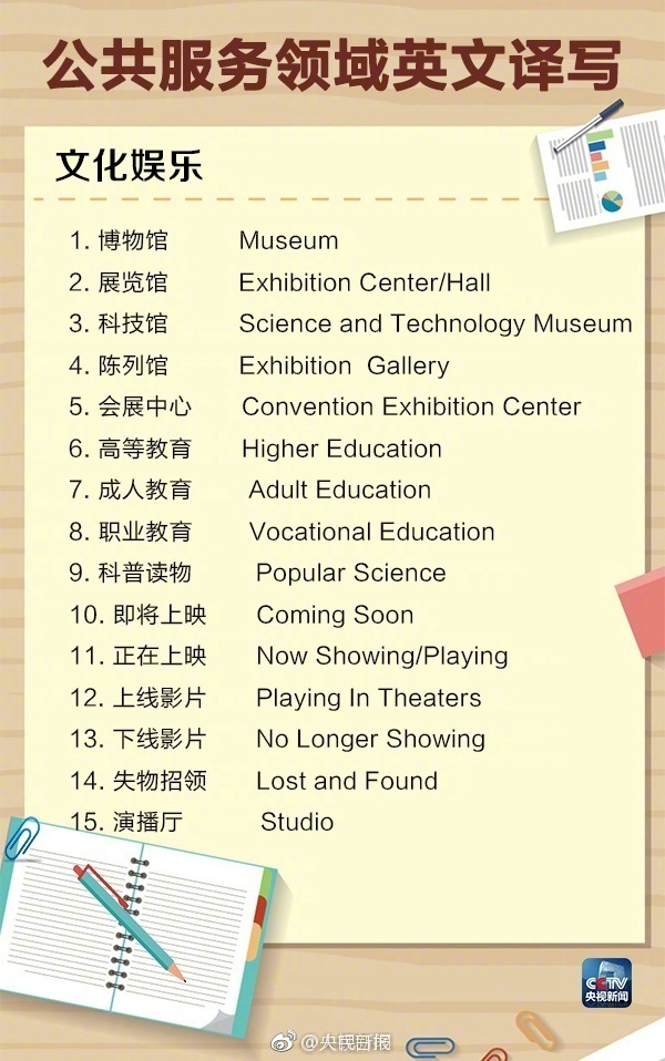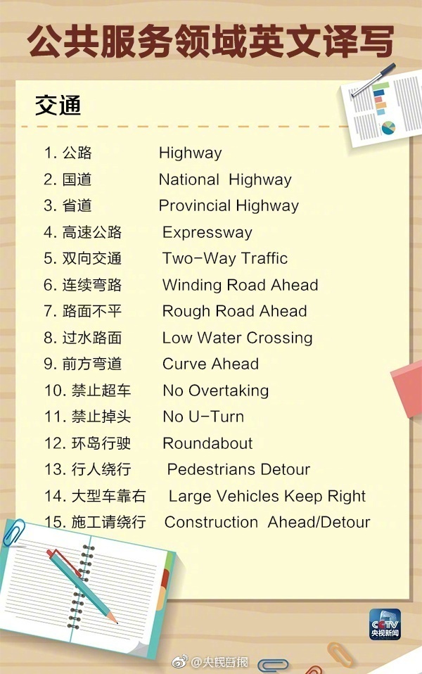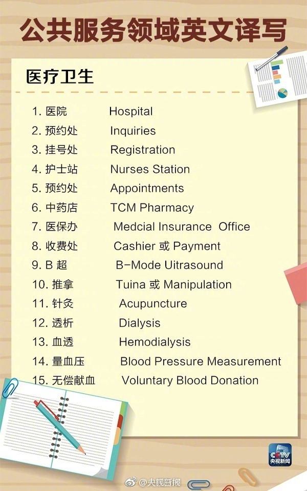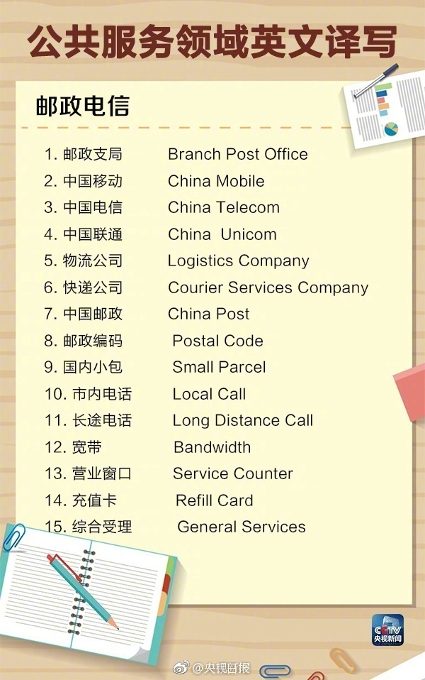 下面是央視提供的公共服務(wù)領(lǐng)域英文譯寫,同時(shí)回答一下標(biāo)題當(dāng)中出現(xiàn)的三個(gè)事物的標(biāo)準(zhǔn)英文翻譯: