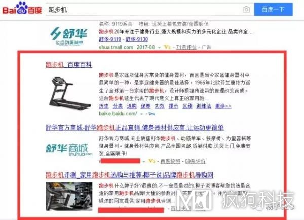 接下來,我們通過搜索關(guān)鍵詞“跑步機(jī)”,來分析一下第一頁(yè),有哪些需求展示,(注明:根據(jù)搜索引擎的原則,誰(shuí)能更好的解決用戶需求,誰(shuí)就排名靠前)如下圖所示: