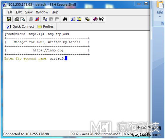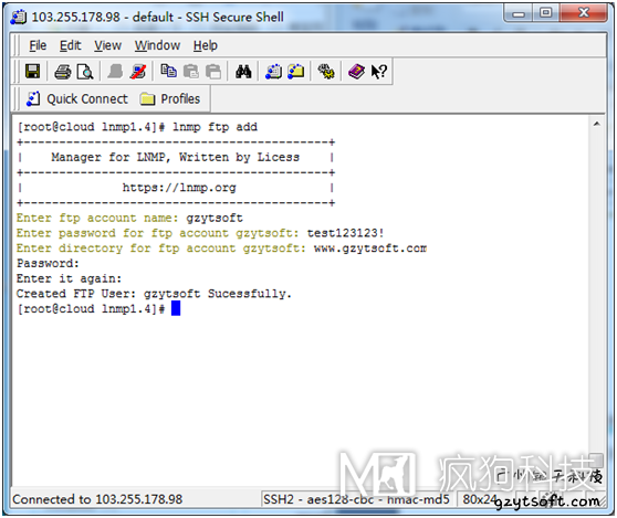 3、通過命令lnmp ftp add 來添加FTP賬號和密碼