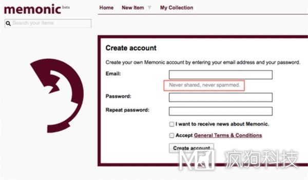 Memonic 是一款筆記應(yīng)用,它在郵箱注冊(cè)輸入框的位置標(biāo)記了一句「不推送,不打擾」,來(lái)向用戶保證郵箱注冊(cè)的安全性,讓用戶放心注冊(cè)。這樣的方式能夠很大的提升用戶注冊(cè)的轉(zhuǎn)化率,因?yàn)檫@是在支持用戶的操作行為,讓用戶不會(huì)被眼前的任務(wù)所困惑。