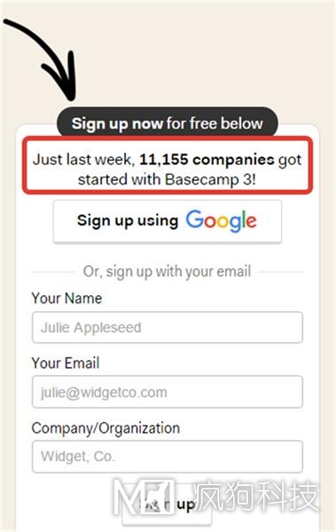 你甚至可以學(xué)習(xí) Basecamp 平臺(tái),通過(guò)文案說(shuō)明來(lái)告訴用戶「僅僅過(guò)去的一周就有 11555 家公司在使用 Basecamp」。以此來(lái)提升用戶對(duì)產(chǎn)品的信任感,增加用戶注冊(cè)的轉(zhuǎn)化率。