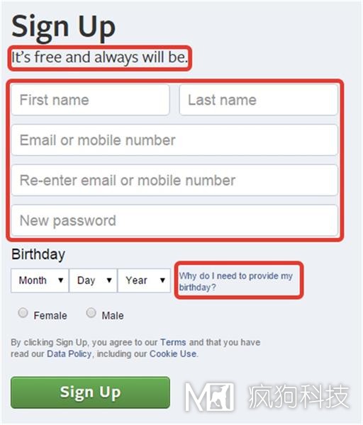 Facebook 會(huì)關(guān)注在登錄頁(yè)面與用戶操作相關(guān)的所有問題。他們?cè)谙旅娴捻?yè)面中解釋了這項(xiàng)服務(wù)是免費(fèi)的(永久的),并且如果你對(duì)填寫出生日期感到疑惑,那么它也會(huì)告訴你需要填寫它的原因。他們?cè)诒韱渭捌渥侄沃惺褂们逦臉?biāo)簽和解釋,目的是消除用戶任何潛在的輸入問題。