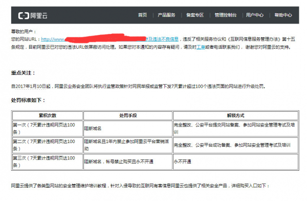 您的網(wǎng)站URL:http://www.********.com/weigui.html涉及違法不良信息,違反了相關服務協(xié)議和《互聯(lián)網(wǎng)信息服務管理辦法》第十五條規(guī)定,目前阿里云已對您的違法URL做屏蔽訪問處理。如果您對本通知的內(nèi)容存有疑問,請及時工單或者電話聯(lián)系我們, 謝謝您對阿里云的支持。