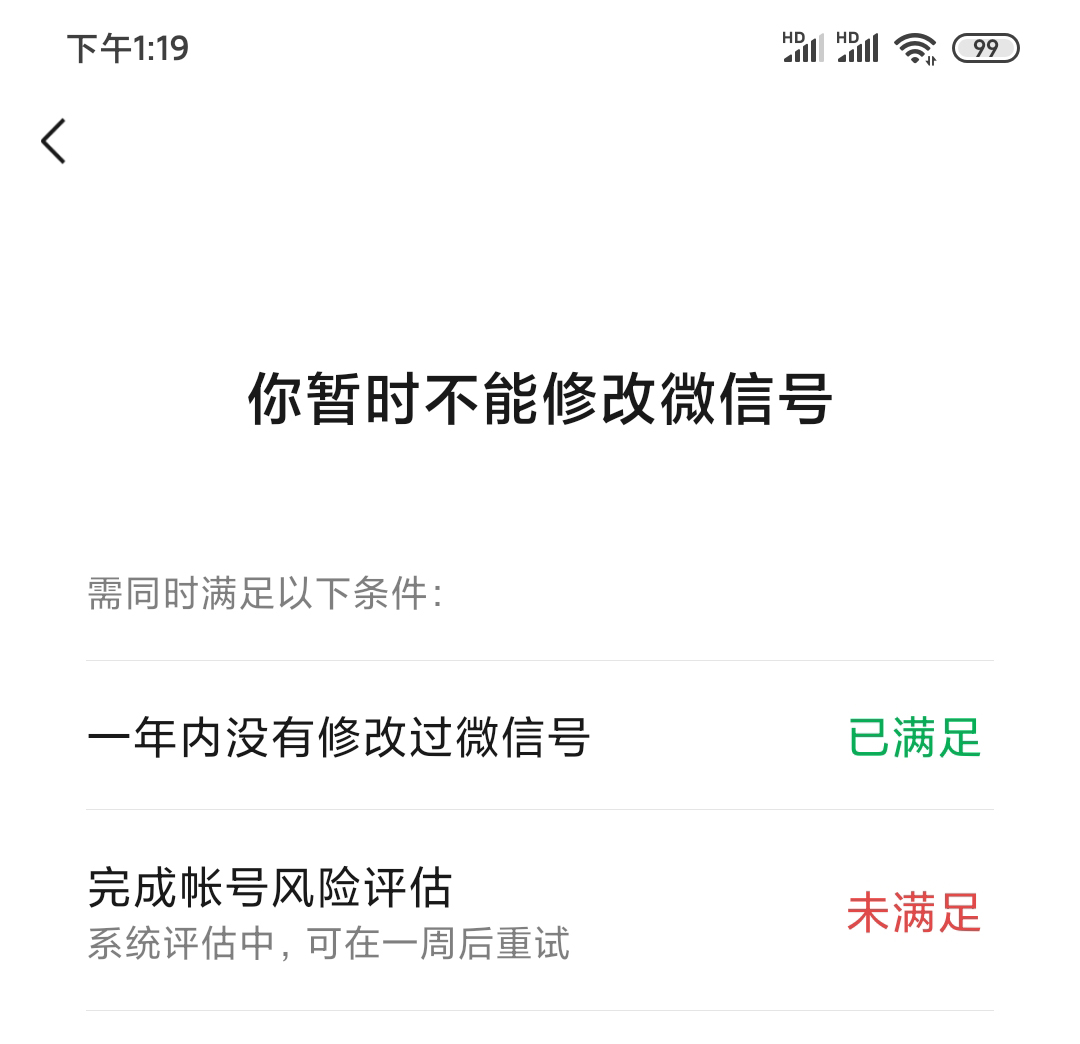 你還別說,瘋狗試了3個(gè)帳號,常用的2個(gè),均是一樣的提示,完成帳號風(fēng)險(xiǎn)評估,系統(tǒng)評估中,可在一周后重試。一個(gè)不常用的微信,反而可以直接修改,對于微信,瘋狗想說,我也是醉了!